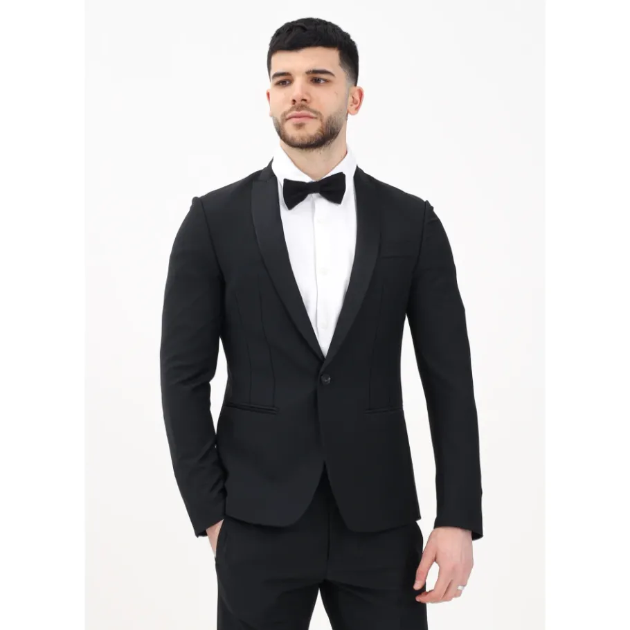 Upgrade je formele look met deze zwarte smokingjas voor heren van PATRIZIA PEPE. De elegante jas met één knoop valt op door de satijnen revers en opgestikte zakken met een borstzak aan de voorkant. Gemaakt van koele wol, heeft het een split achteraan. Het model draagt maat 48 en is 187 cm lang. Aanbevolen strijken op gemiddelde temperatuur. Lente zomer seizoen. Zwarte single-breasted heren regular fit jas voor lente zomer 5SB661A590K103.