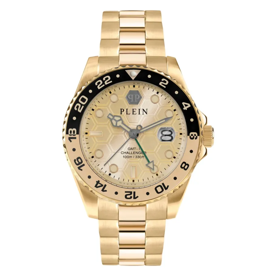 Philipp Plein GMT-I CHALLENGER 44MM – IP GOUDKLEURIGE KAST – GOUDKLEURIGE WIJZERPLAAT – IP GOUDKLEURIGE ARMBAND. Wees gedurfd met dit luxe herenhorloge met een 44 mm goudkleurige roestvrijstalen kast, 10 ATM waterbestendigheid en geleverd in een Philipp Plein doodskop geschenkdoos.