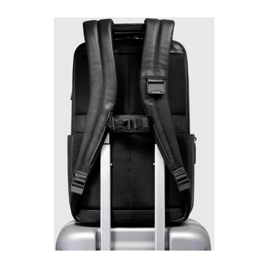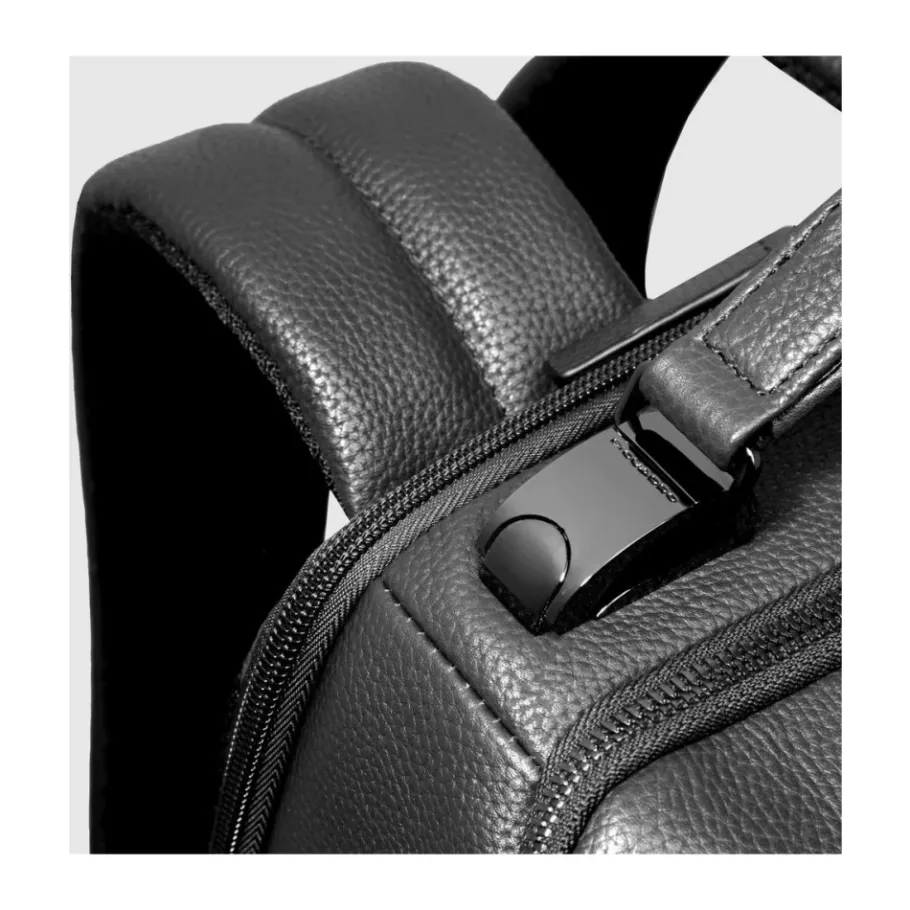 Personalizable travel backpack in leather for laptop and iPad®Pro 12,9 with sternum strap, bottle pocket, RFID and shock-absorbing protection