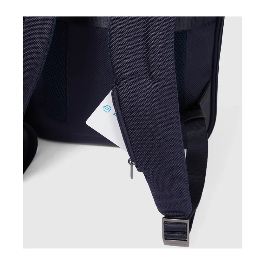 Expandable, slim laptop backpack in fabric and leather with iPad® compartment, RFID and shock absorbing protection