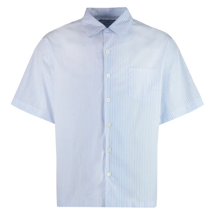 Het Prada Double Match Shirt is een gestreept katoenen overhemd met korte mouwen en een borstzak aan de voorkant, ontworpen voor smart-casual warm weer. Belangrijkste kenmerken: Blauw | Lichtblauw | Katoen | Borstzak aan de voorkant | Gestreept patroon | Korte mouwen | Samenstelling & verzorging: 100% katoen | Machinewas koud, fijne was. Niet bleken. Droogtrommel laag of hangend drogen. Warm strijken indien nodig.