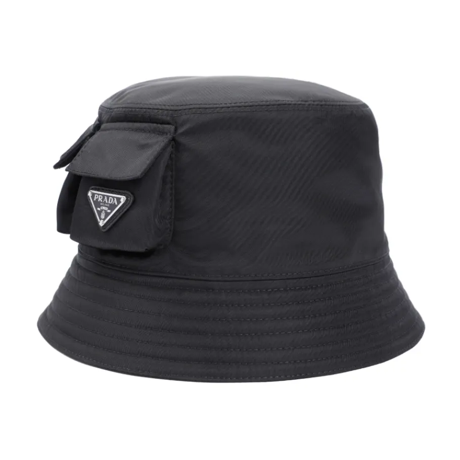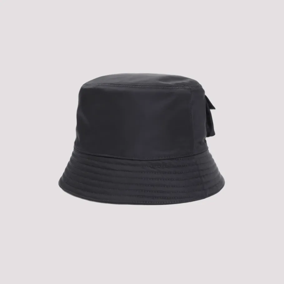 Blijf stijlvol met deze zwarte Prada hoed. Gemaakt van hoogwaardige polyamide stof, heeft het een uniek ontwerp met een zijflapzak en cargozak. Het driehoekige metalen logo voegt een vleugje luxe toe. Perfect om je look compleet te maken. Bestel de jouwe nu!
