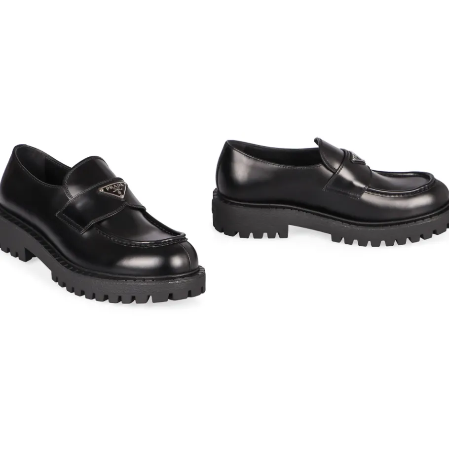 Prada leren loafers zijn instapschoenen van kalfsleer die klassieke loaferdetails combineren met een robuuste profielzool. Ze zijn geschikt voor smart-casual en alledaagse urban kleding en benadrukken de kenmerkende driehoekige plaque van het merk. Belangrijkste kenmerken: Zwart | Kalfsleer | rubberen zool | Instapmodel | Leren binnenzool | Ronde neus | Geëmailleerde driehoekige plaque op de band | Carrarmato (profiel) loopvlak | Dubbele zoolrand | Samenstelling & verzorging: Bovenkant: 100% Kalfsleer | Zool: 100% Rubber