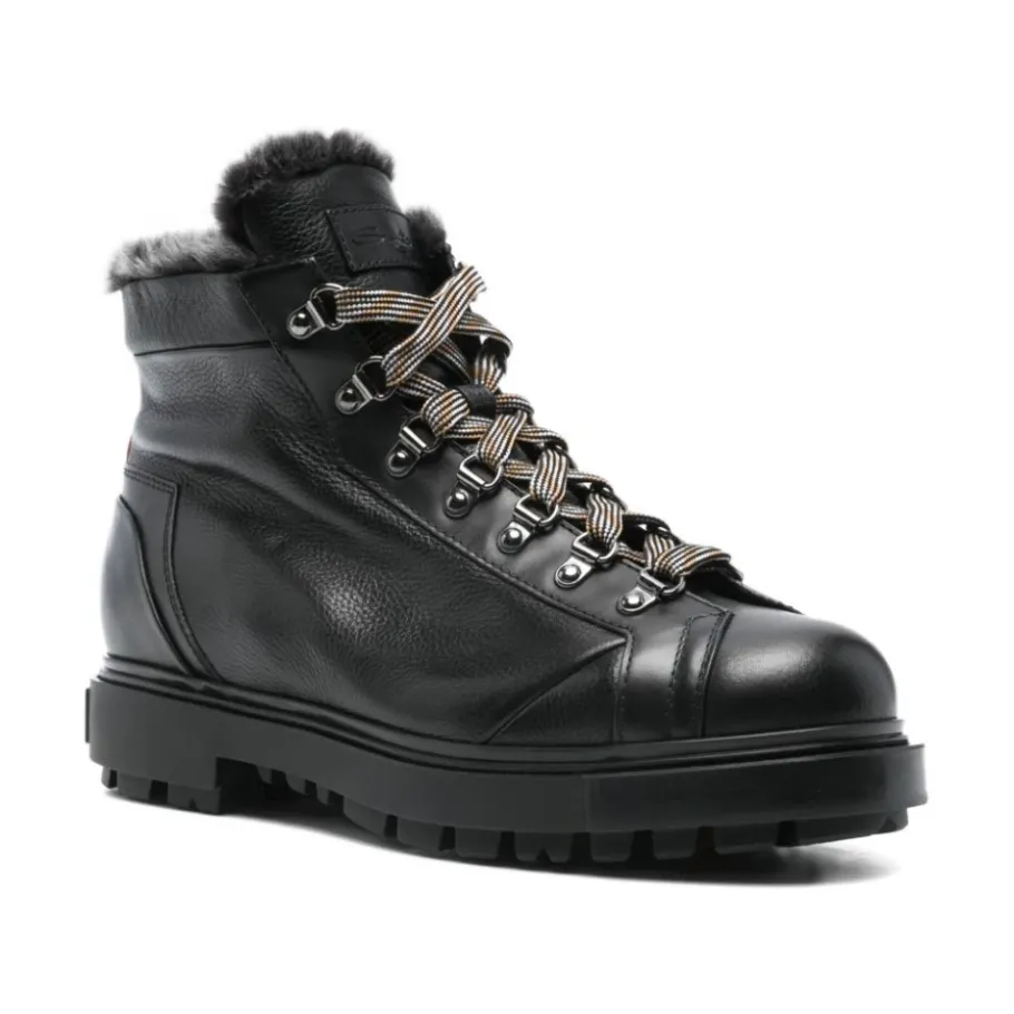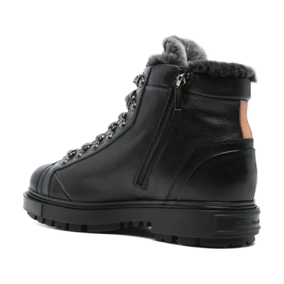 De Santoni Gewalkt Leren Wandelschoen met Bont combineert een gewalkt leren bovenwerk met een shearling-voering voor betrouwbare warmte op koude dagen. Het op wandelen geïnspireerde silhouet en de rubberen zool maken hem geschikt voor winterse stadskleding en licht outdoor gebruik. Belangrijkste kenmerken: Zwart | Leer | Shearling voering voor warmte | leren bovenwerk | Gekruiste vetersluiting | Rubberen zool met profiel | Enkelhoogte | Gewalkt leren afwerking | Contrast oranje detail op de rubberen zool | Wandelschoen-stijl veterogen en metalen haken | Ronde neus | Samenstelling & verzorging: Leer