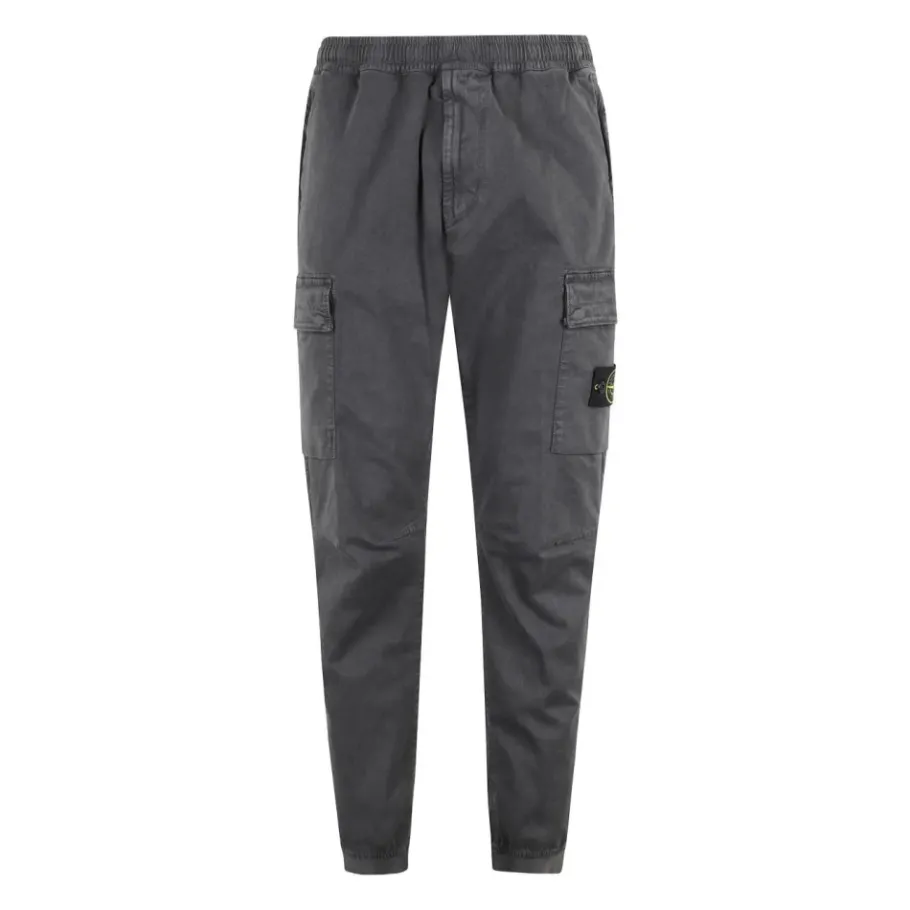 Stone Island slim-fit broek voor mannen met verticale zakken, verborgen ritsen, achterzak met drukknoop, plooizak op de benen, Stone Island embleem, gevormde knieën, elastische broekspijpen, elastische tailleband met interne trekkoord, ritssluiting en regular tapered pasvorm. Gemaakt van 97% katoen, 3% elastaan in Roemenië.