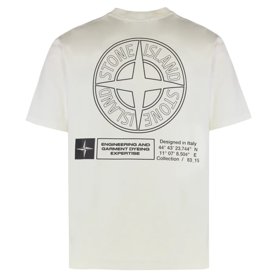 Stone Island T-shirt met korte mouwen van katoenen jersey met het merklogo op de borst en een Compass-print op de rug. Een eenvoudig T-shirt met een normale pasvorm voor dagelijks casual gebruik. Belangrijkste kenmerken: Beige | Ivoor | Katoen | Korte mouwen | Stone Island-logo op de borst | Compass-print op de rug | Afmetingen en pasvorm: Normale pasvorm | Samenstelling en onderhoud: 100% katoen | Machinewas koud, drogen op lage temperatuur.