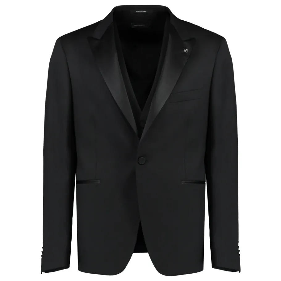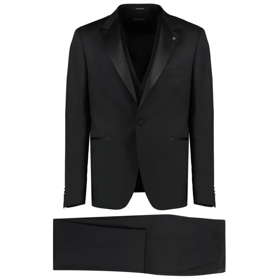 Het Tagliatore wollen driedelig pak combineert een getailleerde constructie met satijnen reversdetails voor een verfijnde, formele look. Ideaal voor evenementen en gelegenheden die om een klassiek driedelig ensemble vragen. Belangrijkste kenmerken: Zwart | Scheerwol | Twee paspelzakken aan de voorkant en een borstzak op het jasje | Knopen aan de manchetten van het jasje | Twee steekzakken op de broek | Twee paspelzakken achter op de broek | Single-breasted jasje met één knoop | Satijnen reverskraag | Achterkant met split | Single-breasted vest | Samenstelling & verzorging: 100% scheerwol