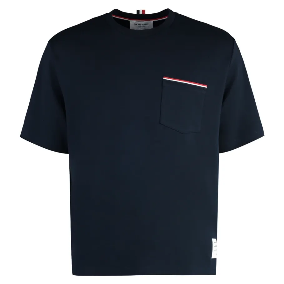 Het Thom Browne katoenen T-shirt met ronde hals combineert een klassiek silhouet met een ronde hals met een driekleurig detail op de achterkant en zijsplitten in de zoom voor een verfijnde alledaagse look. Belangrijkste kenmerken: Blauw | Katoen | Zoomlijn met zijsplitten | Borstzak | Ronde hals | Korte mouwen | Driekleurig detail op de achterkant | Geborduurd logo op de voorkant | Afmetingen & pasvorm: Thom Browne maatconversie: 00 = XXS, 0 = XS, 1 = S, 2 = M, 3 = L, 4 = XL, 5 = XXL | Samenstelling & onderhoud: 100% katoen | Alleen chemisch reinigen.