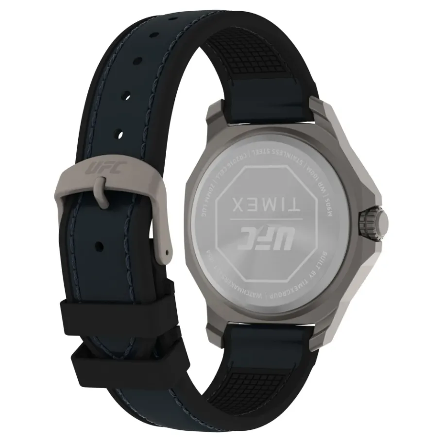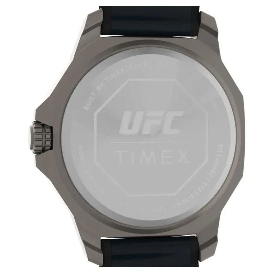 Ontdek de Timex UFC Reveal-horloge voor heren, met een strak ontwerp met een 41 mm roestvrijstalen kast en een zwart siliconen band. Dit analoge horloge heeft een mineraalglasdisplay, quartz uurwerk en is waterbestendig tot 10.00 bar. Bestel nu!