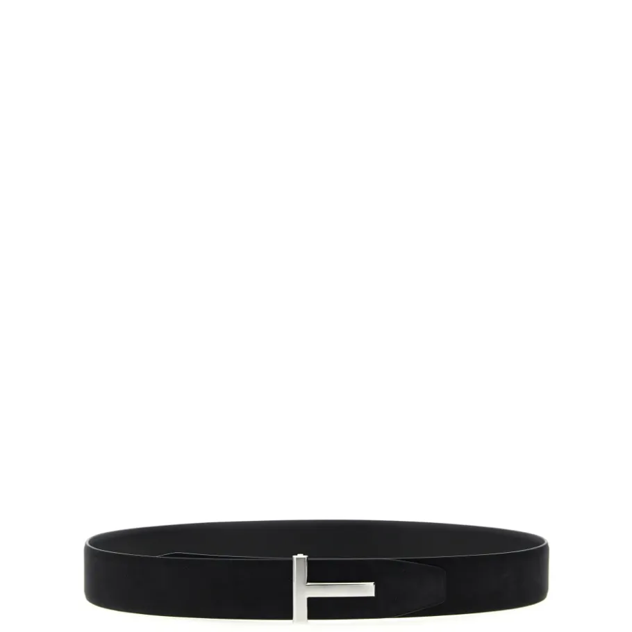 De Tom Ford T Reversible Belt combineert glad kalfsleer met nubuck en een metalen T-logo gesp voor veelzijdig, omkeerbaar gebruik. Belangrijkste kenmerken: Zwart | Kalfsleer en nubuck | Omkeerbaar | Drukknopsluiting | Metalen T-logo gesp | Gladde lederen en nubuck afwerking | Afmetingen & pasvorm: Breedte: 4 cm | Valt normaal qua maat | Samenstelling & verzorging: Kalfsleer | Nubuck | Metaal