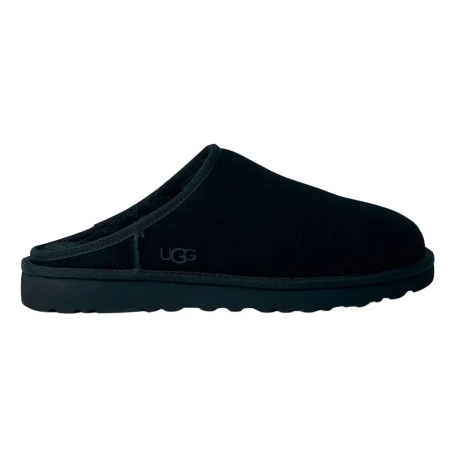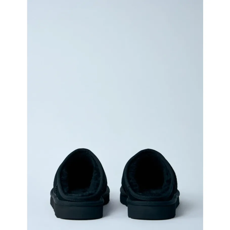 UGG Classic Slip-On Mules combineren het gemak van instappers met een met shearling gevoerde binnenkant voor dagelijks comfort en warmte. Belangrijkste kenmerken: Zwart | Suède | Instapmodel | Shearling gevoerd | Ronde neus | Open achterkant | Logo-motief aan de zijkant