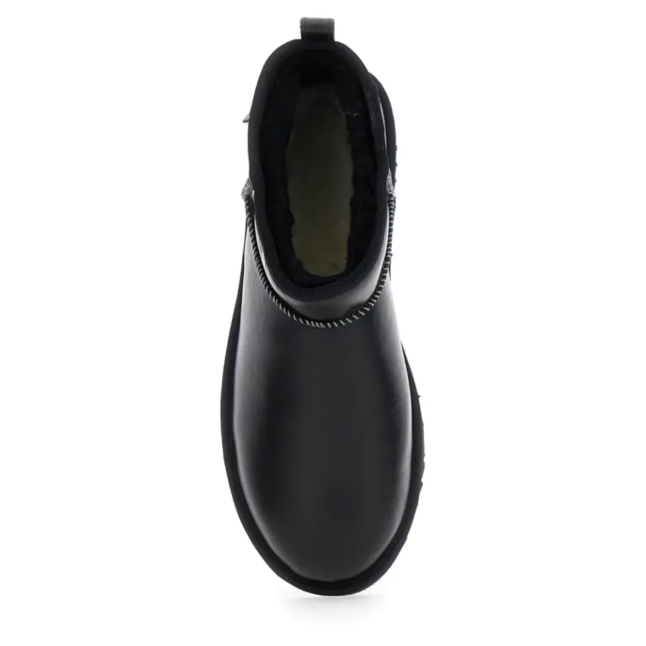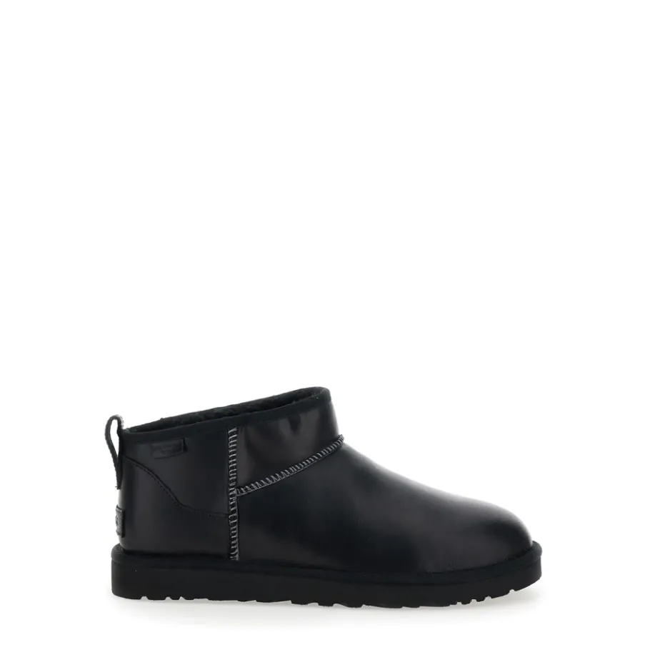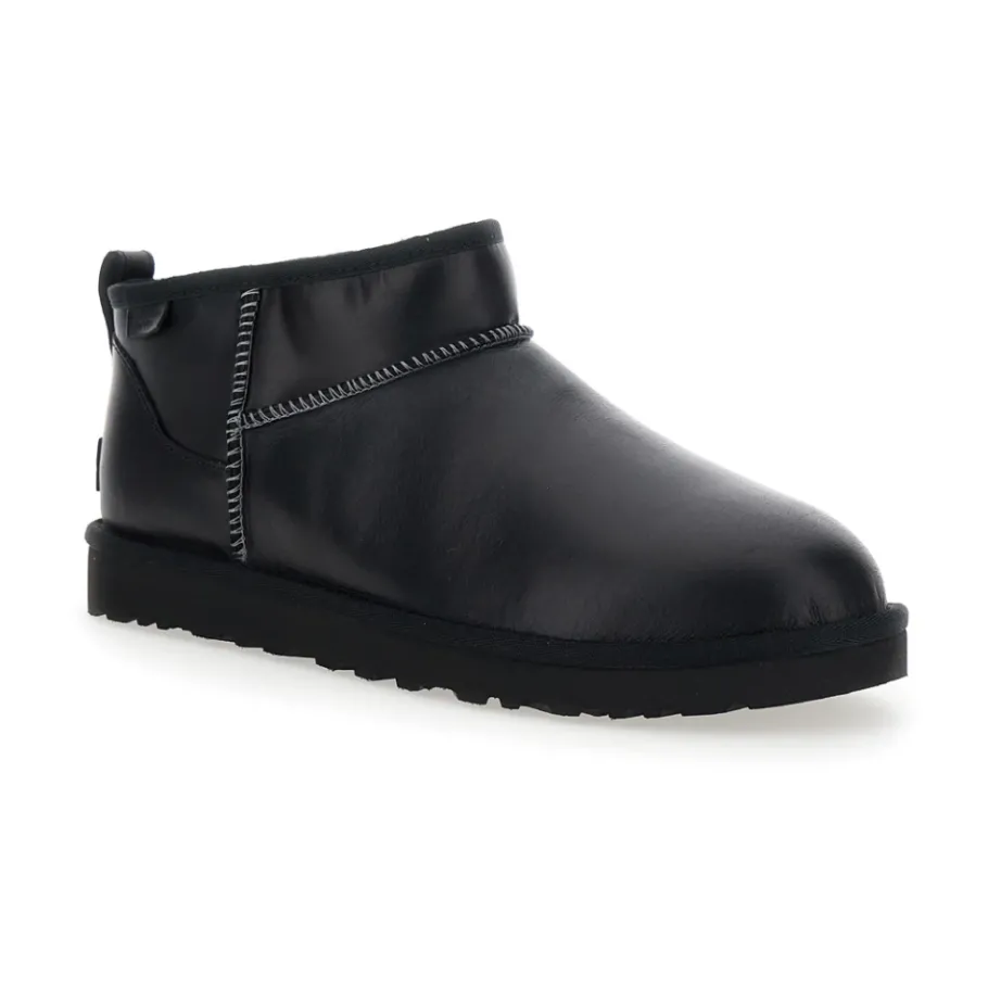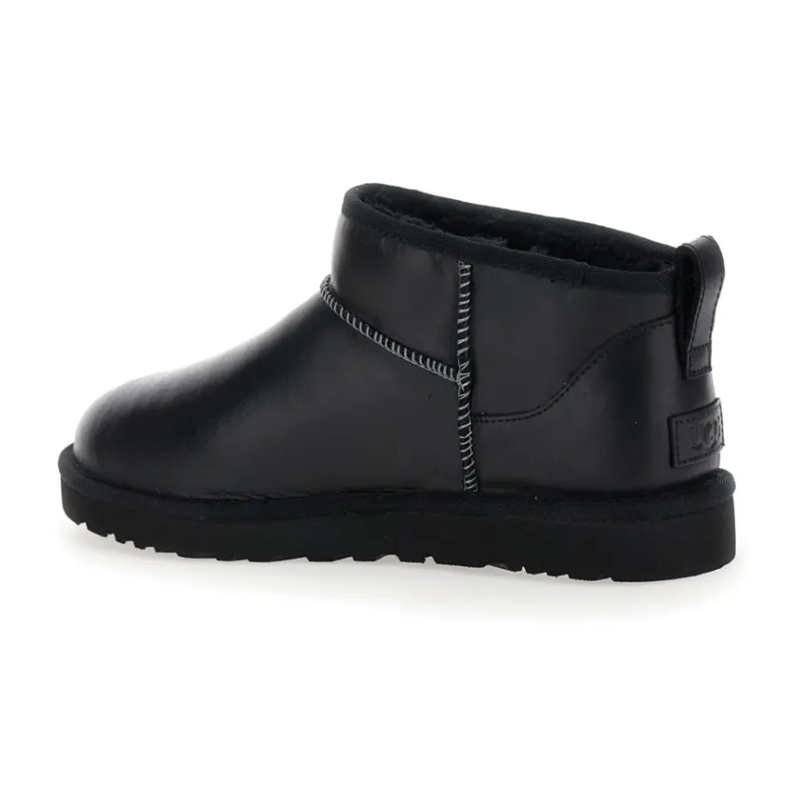 De UGG Classic Ultra Mini is een compacte leren enkelboot, ontworpen voor dagelijks gebruik in de winter. De laars combineert een geïsoleerde UGGplush-voering met een gedempte EVA-loopzool voor comfort en grip. Belangrijkste kenmerken: Zwart | Leer | Geïsoleerde UGGplush-voering voor warmte | Gedempte EVA-loopzool voor schokabsorptie | Rubberen loopzool met profiel voor grip | Instapmodel | Treklus aan de achterkant om gemakkelijk aan en uit te trekken | Ronde neus | Mini-/enkellengte schacht | Contrasterende stiksels | Logopatch aan de achterkant | Afmetingen en pasvorm: Hakhoogte: 2,5 cm | Schachthoogte: 8,0 cm | Zoolhoogte: 2,0 cm | Lengte binnenzool (maat 42): 28 cm | Samenstelling en onderhoud: Buitenkant: Kalfsleer 100% | Voering: 60% wol, 40% lyocell | Binnenzool: 60% wol, 40% lyocell | Loopzool: EVA / Rubber