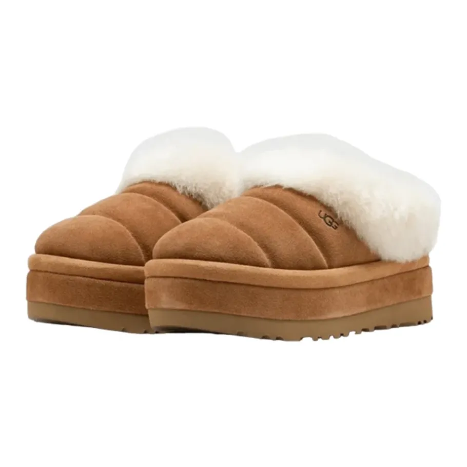UGG Tazzlita Slipper — een suède platform slipper met een zachte voering en een schapenvacht kraag die comfort voor binnenshuis combineert met een straatwaardige stijl. Belangrijkste kenmerken: Chestnut | Suède | Topisch aangebrachte waterafstotende behandeling | EVA-loopzool voor lichtgewicht grip | Platformzool voor extra hoogte | Zacht gevoerd voetbed voor comfort | Suède-omwikkelde EVA-middenzool | Suède bovenwerk | Schapenvacht kraag | In reliëf gemaakt UGG-logo | Gewatteerd/gestikt detail op het bovenwerk | Afmetingen & pasvorm: Platformhoogte: 4,45 cm | Valt iets klein; we raden aan een halve maat groter te nemen (op basis van de verstrekte richtlijnen). | Samenstelling & onderhoud: Suède bovenwerk | Schapenvacht kraag | Vampvoering: UGGplush (60% wol, 40% lyocell) | Binnenzool: UGGplush (60% wol, 40% lyocell) | EVA-middenzool | EVA- of SugarSole EVA-loopzool | Polyester binding | Maak schoon met een suède reiniger of UGG verzorgingsset. Bescherm voor het dragen met een waterafstotende behandeling. Vermijd machinewassen en langdurige blootstelling aan vocht..UGG`s zitten in het begin soms strak, maar de voering kan uitrekken naarmate u ze vaker draagt. We raden u aan uw gebruikelijke maat te kiezen.