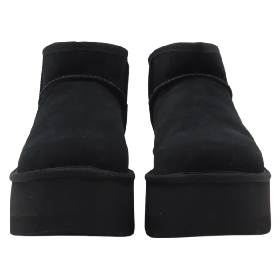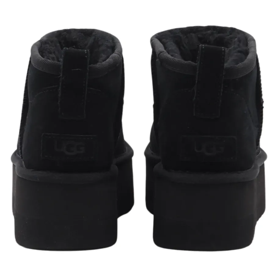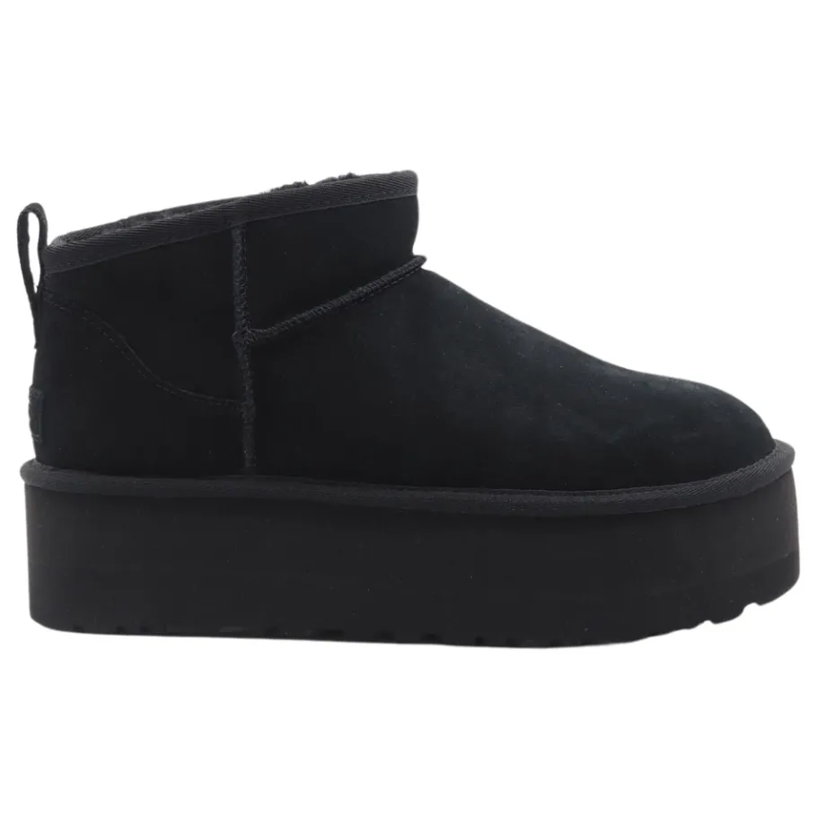 UGG Ultra Mini Platform laarzen voor heren in het zwart. 5 cm zoolhoogte, shearling interieur, lichtgewicht Sugar Sole. Maak je look compleet met deze link..UGG`s zitten in het begin soms strak, maar de voering kan uitrekken naarmate u ze vaker draagt. We raden u aan uw gebruikelijke maat te kiezen.