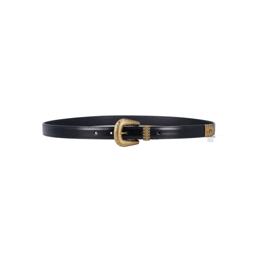 Upgrade je look met deze Valentino Garavani riem gemaakt van premium geborsteld kalfsleer. Met een afgeronde gesp, lus en metalen punt met gegraveerde details en VLogo accent. Afgewerkt in antiek messing voor een vintage uitstraling, voegt deze slanke 20 mm silhouet een verfijnde touch toe aan elke outfit. Perfect voor zowel casual als formele kleding.