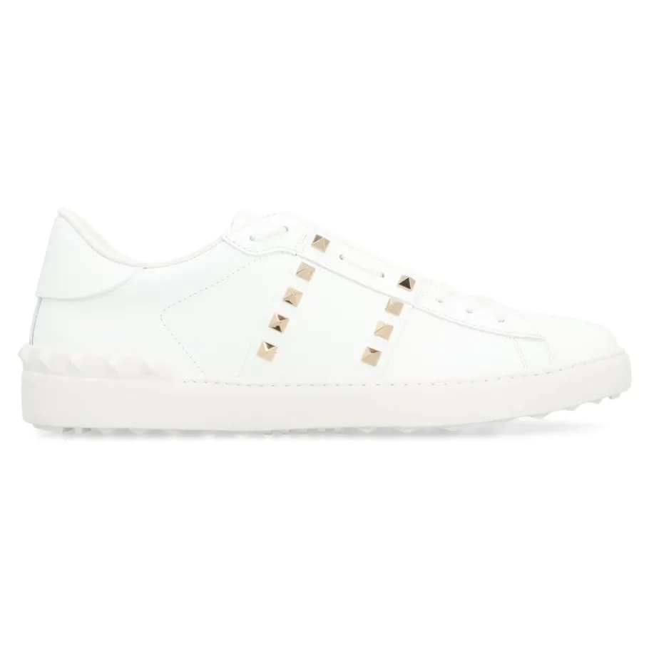 De Valentino Garavani Rockstud Untitled Sneakers combineren glad kalfsleer met de kenmerkende piramidestuds van het label voor een verfijnde alledaagse sneaker. Belangrijkste kenmerken: Wit | Kalfsleer | Vetersluiting | Gewatteerde enkel | Rubberen zool | Decoratieve goudkleurige metalen studs | Ronde neus | Laag model | Kenmerkende Rockstud-details | Afmetingen en pasvorm: Valt normaal qua maat — neem je normale maat | Samenstelling en verzorging: Buitenkant: 100% kalf | Binnenkant: 100% leer | Zool: 100% rubber