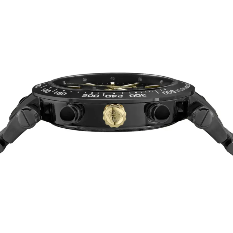 Ontdek de Versace BOLD CHRONO horloge voor heren, met een strak zwart roestvrijstalen ontwerp. Dit quartz horloge heeft een zwarte wijzerplaat, zwarte kast en saffierglas. Met een kastgrootte van 46 mm, 5 ATM waterbestendigheid en vouwsluiting straalt dit horloge luxe en stijl uit.
