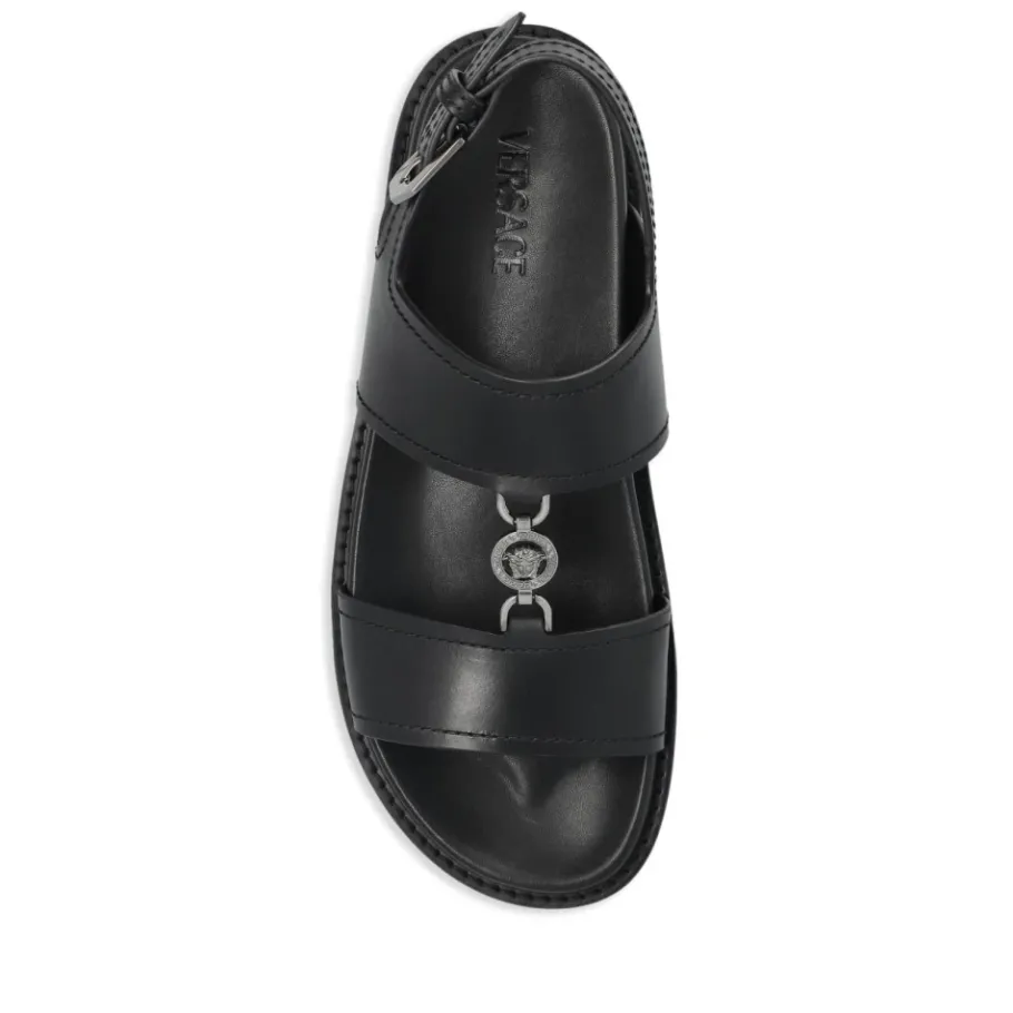 De zwarte sandalen met gesp van Versace zijn ontworpen voor comfort en stijl, met een veilige enkelband met gespsluiting en een rubberen zool. Belangrijkste kenmerken: Zwart | Rubber | Enkelband met gespsluiting | Gegoten voetbed | Inlegzool van leer met merklogo |