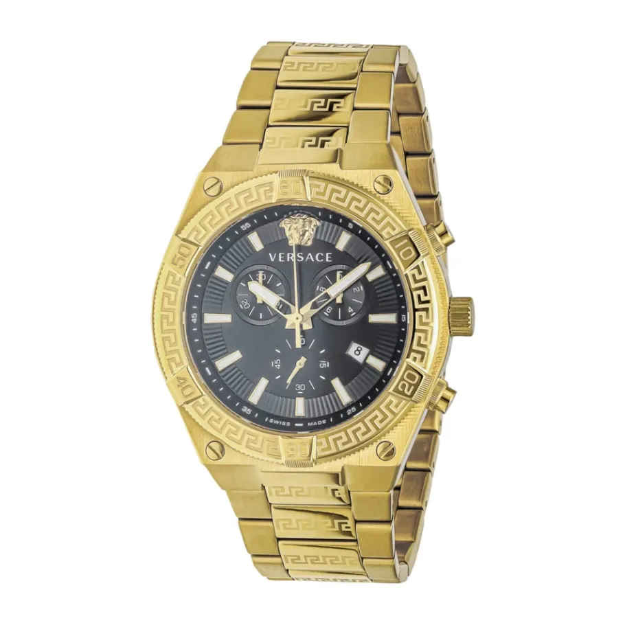 Ontdek de Versace SPORTY GRECA horloge voor heren, een luxueus horloge dat stijl en verfijning uitstraalt. Met een quartz uurwerk, gouden roestvrijstalen armband, zwarte wijzerplaat en Zwitsers vakmanschap is dit horloge een statement van elegantie. Met een kastgrootte van 46 mm, bandbreedte van 22 mm en waterbestendigheid tot 5 ATM biedt het zowel stijl als functionaliteit. Perfect voor de moderne man die kwaliteit en precisie waardeert.