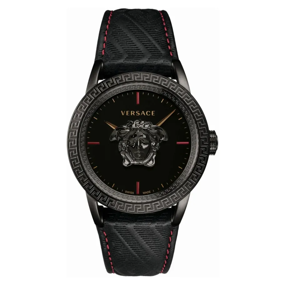 Ontdek het Versace herenhorloge, met een strak ontwerp met een zwarte lederen band, saffierglas en quartz uurwerk. Gemaakt in Zwitserland, is dit horloge waterbestendig tot 5 bar en heeft functies voor uren en minuten.