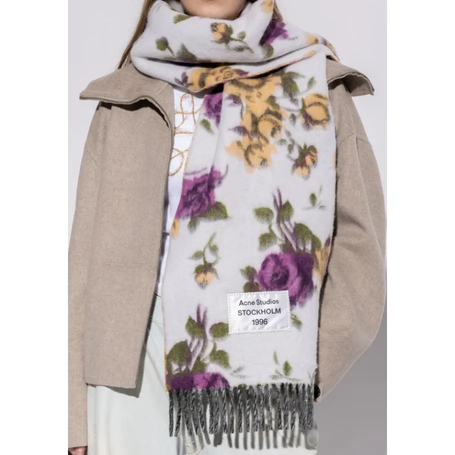 De Acne Studios Fringed Wool Scarf combineert een zachte, pluche textuur met een vervaagd bloemmotief op een grijze achtergrond, ontworpen voor veelzijdige styling en betrouwbare warmte. Belangrijkste kenmerken: Grijs | Multicolor | Wol | Warme thermische isolatie | Extra-zacht comfort | Pluche textuur met hoge pool | Veelzijdige stylingopties (wikkelen, draperen, knopen) | Geborduurd logo label | Franjes aan de uiteinden | Zacht, ruig handgevoel | Rechthoekige vorm | Vervaagd bloemmotief | Centraal geplaatst logo | Royale lengte voor gevarieerd draperen | Afmetingen & pasvorm: Hoogte: 33 cm | Breedte: 200 cm | One size | Samenstelling & onderhoud: 62% Wol, 18% Alpaca, 20% Nylon | Uitsluitend chemische reiniging.