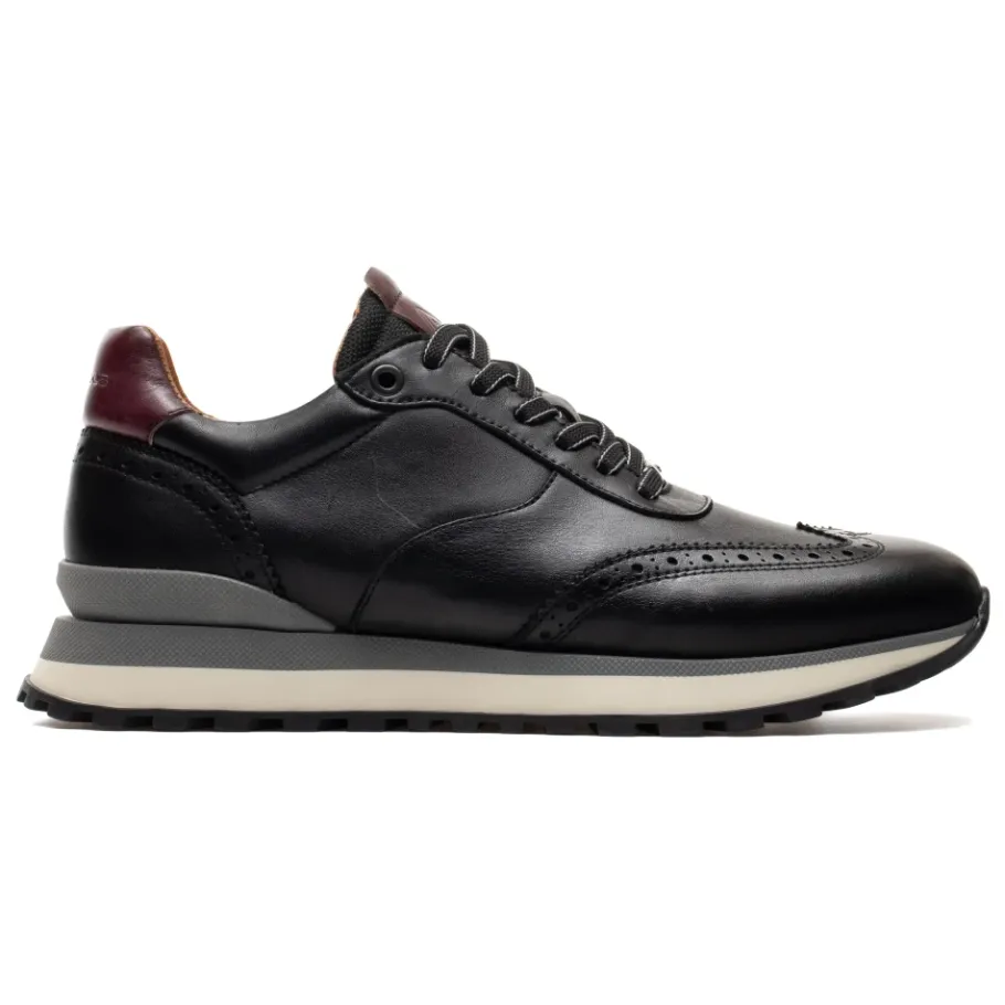 De ambitieuze PARK Brogue Runner combineert een sportief runner silhouet met klassieke brogue details en een driekleurige zool. Het is ontworpen als een veelzijdige, alledaagse sneaker die past bij zowel casual als smart-casual looks. Belangrijkste kenmerken: Zwart | Leer | Leren voering | Leer met patina-effect | Brogueing met geperforeerde details | Driekleurige zool | Contrasterend achterpand | Sportief runner silhouet | Afmetingen en pasvorm: Normale pasvorm (valt normaal) | Samenstelling en verzorging: Bovenkant: Leer / Textiel | Voering: Leer | Buitenzool: Geëxpandeerd thermoplast