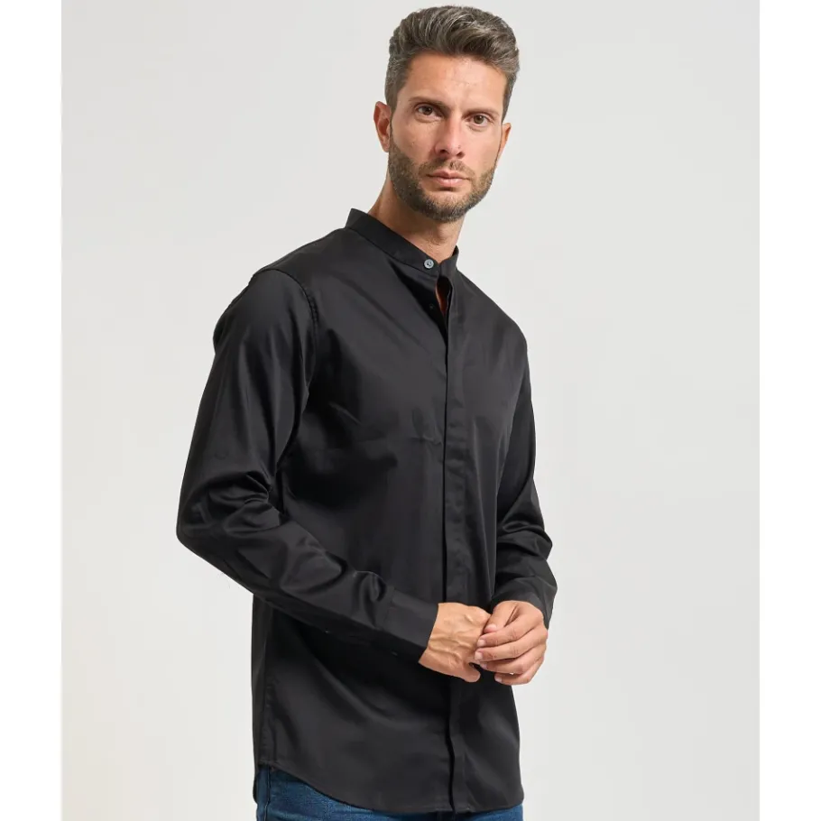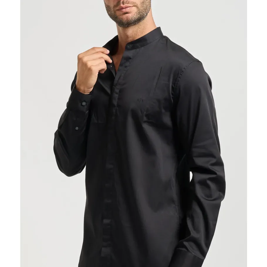 Upgrade je casual stijl met dit heren Armani Exchange overhemd met opstaande kraag en verborgen knoopsluiting. Gemaakt van effen katoen, is dit overhemd een veelzijdige toevoeging aan je garderobe. Het model is 185 cm lang en draagt maat M.