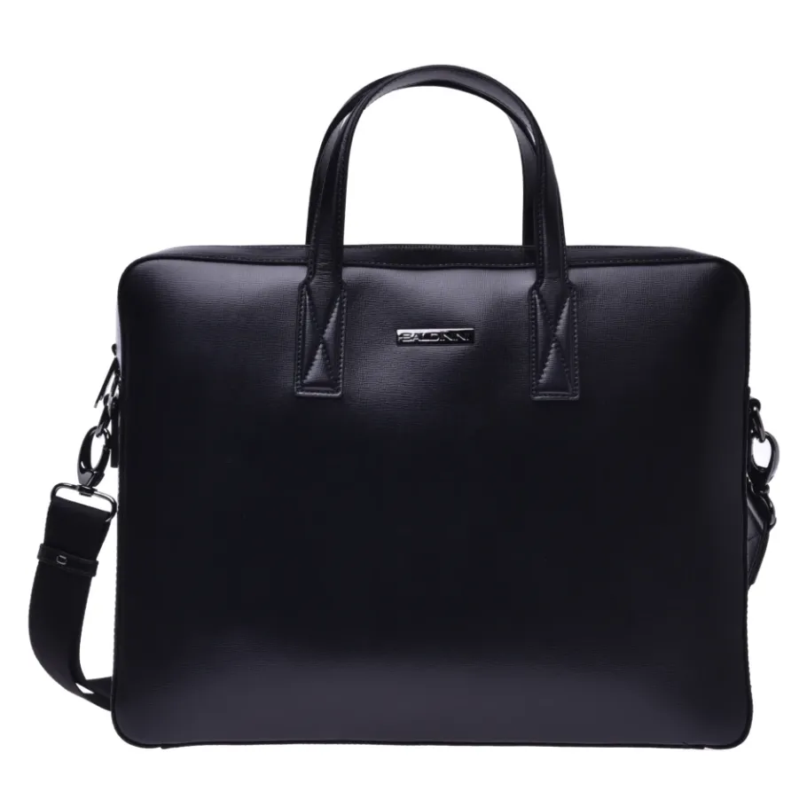A sophisticated yet fuss-free work bag for the office. Featuring two short handles and a long fabric strap, this black calfskin leather piece is secured with a zip fastening. The gunmetal hardware details add allure. This is made in Italy.