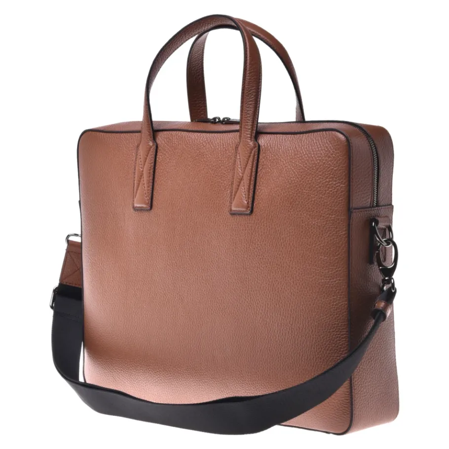 Here’s a great briefcase for work. Introduced in a versatile tan shade, this calfskin leather piece features two short handles and a flat long canvas strap. Our signature logo adorns the front. This piece is made in Italy.