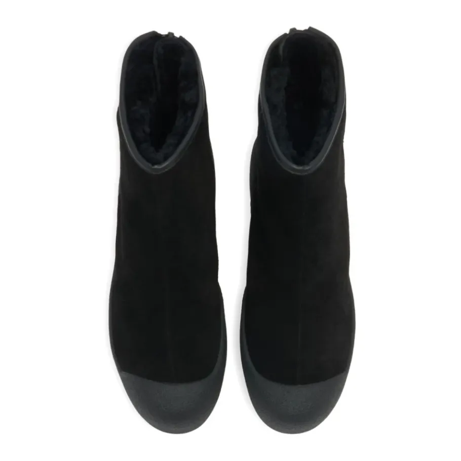 Belangrijkste kenmerken: Zwart | Suède | Ritssluiting achter | Ronde neus | Platformzool | Enkelhoogte | Getextureerde afwerking