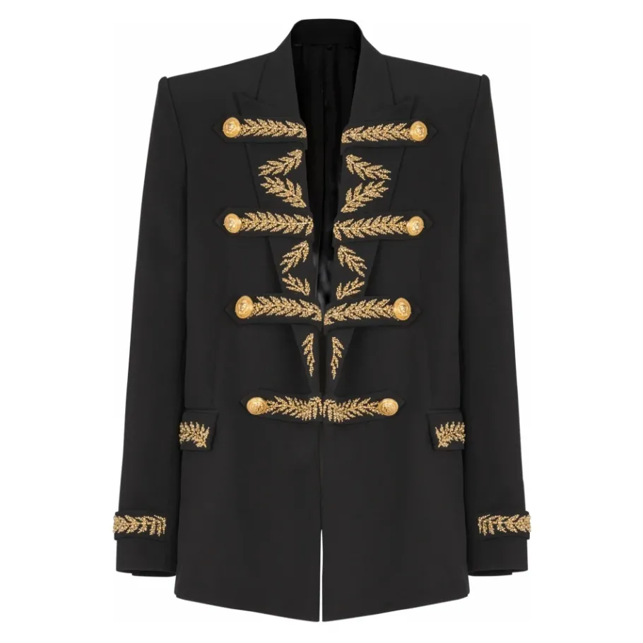 Geborduurde crêpe jas Geborduurde Italiaanse op maat gemaakte kraag Geborduurde kikkerstijl knoopsluiting tabs aan de voorkant Gestructureerde schouders Lange mouwen Rechte manchetten met decoratieve geborduurde tab en knoop 2 zijdelingse insteekzakken met geborduurde klep Bladeren parelgeborduurd patroon ‘Chain Lion’ knopen in goudmetaal Satijnen voering 2 insteekzakken met knopen Rechte snit Model meet 190 cm en draagt maat 48 Hoofdmateriaal: 100% viscose Gemaakt in India Artikel: FH1SM176PD09 100% van de viscosevezels die voor dit kledingstuk worden gebruikt, komen uit gecertificeerde, beheerde bossen