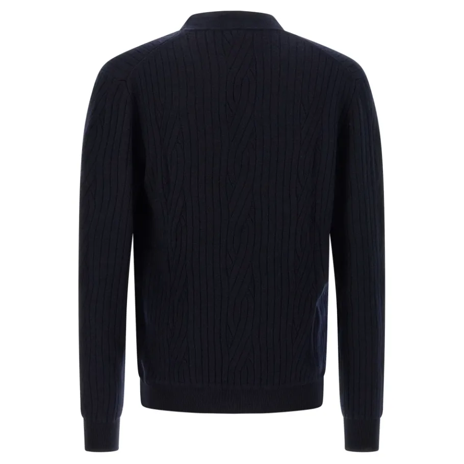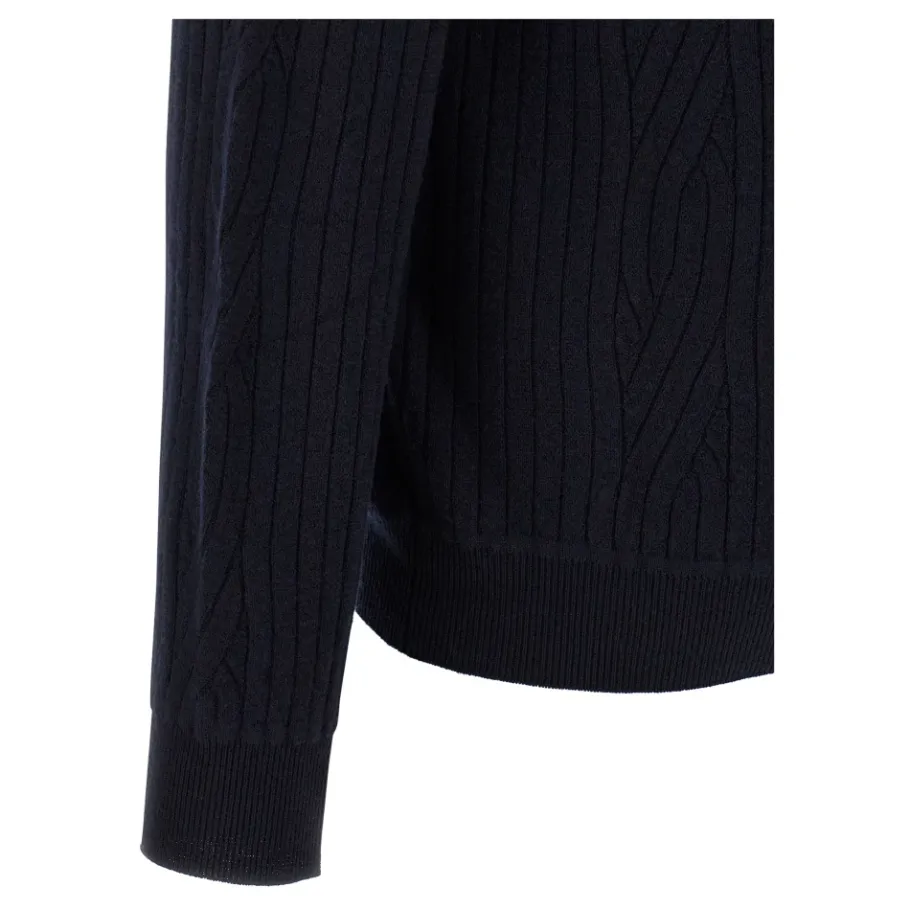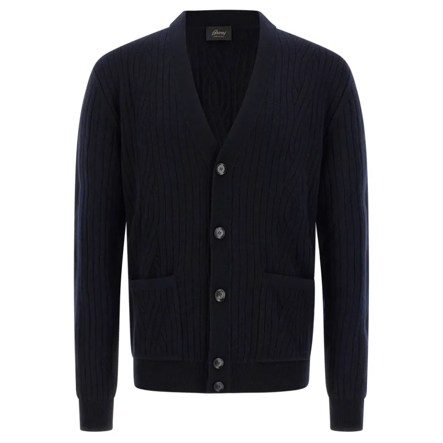 Brioni wollen en kasjmieren cardigan met ribbels en vlechtwerkdetails, een V-hals en knoopsluiting aan de voorkant voor verfijnde laagjes. Belangrijkste kenmerken: Blauw | Wollen en kasjmieren mix | Knoopsluiting aan de voorkant | Zakken | Ribbel- en vlechtwerktextuur | V-hals | Lange manchetten | Samenstelling & verzorging: Wol | Kasjmier