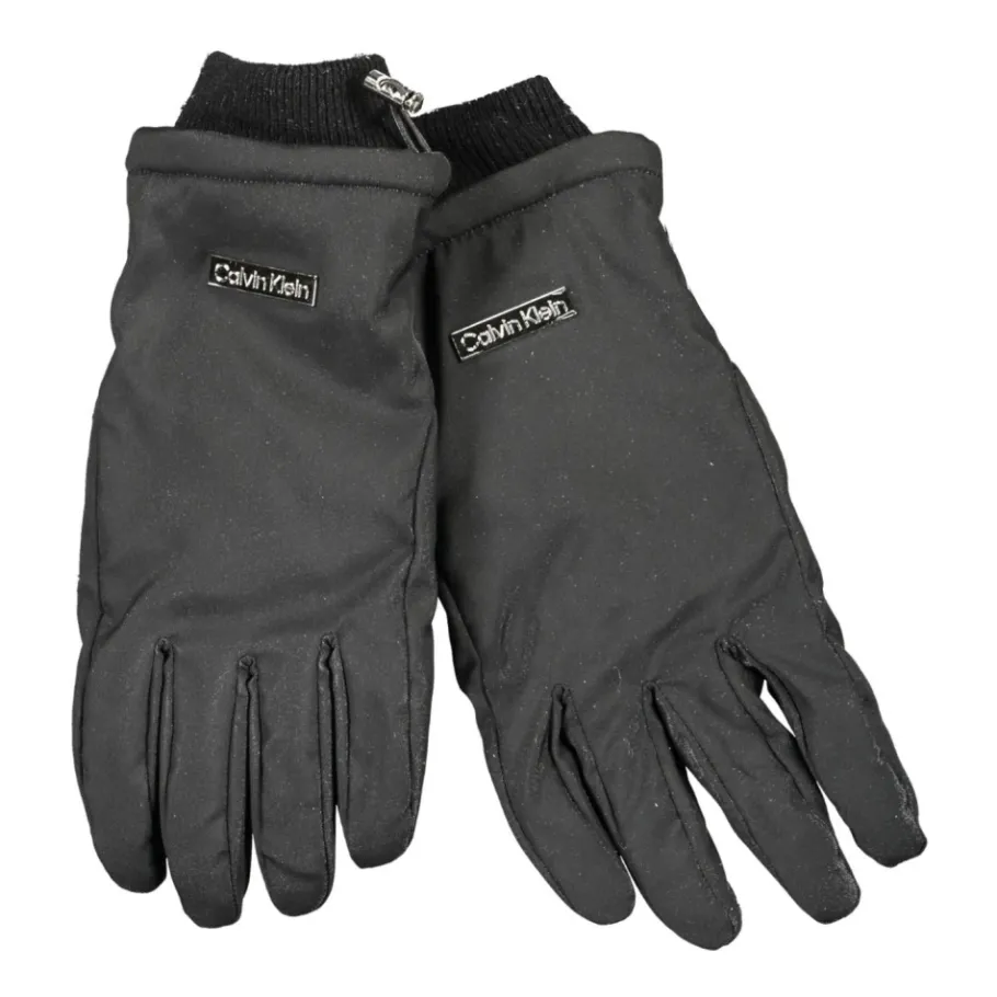 Blijf warm en stijlvol met deze zwarte polyester handschoenen van Calvin Klein. Met een metalen gesp, trekkoord en logo detail zijn deze handschoenen perfect voor de moderne man.