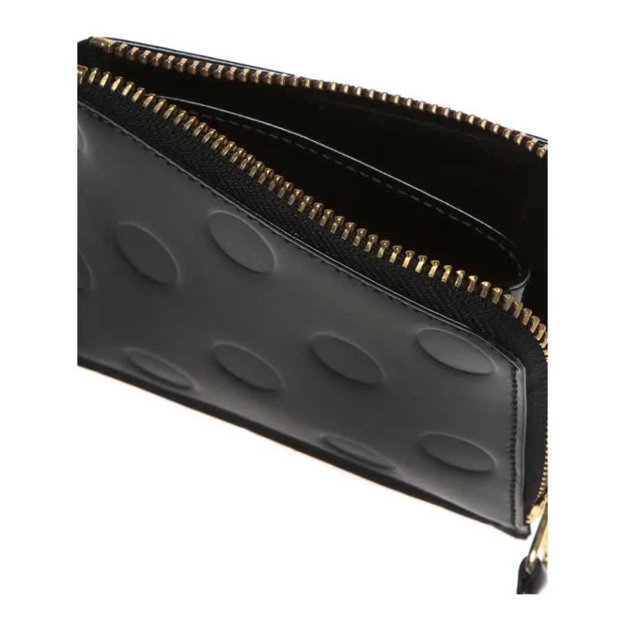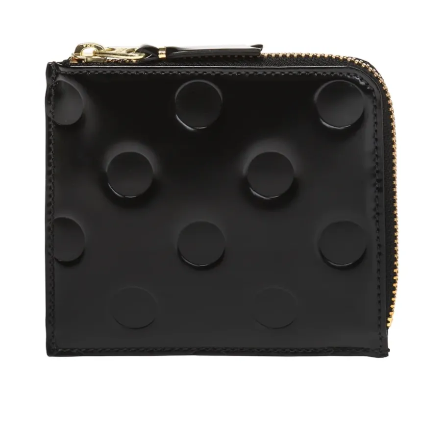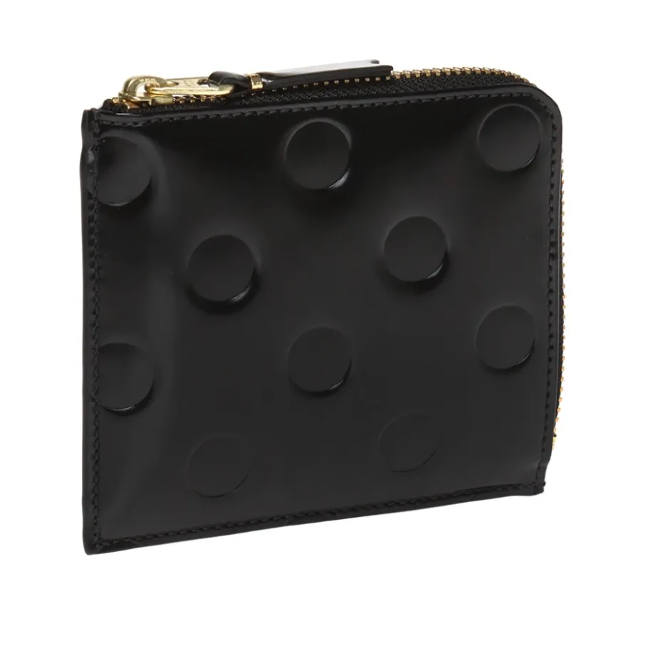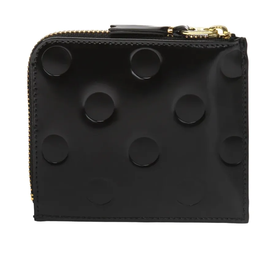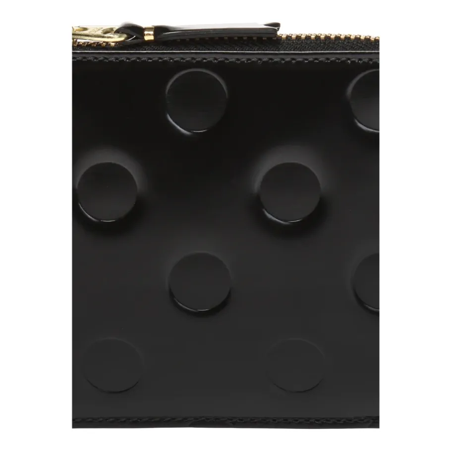 Zwarte portemonnee van Comme des Garçons. Gemaakt van koeienleer verrijkt met reliëf motief van polka dots. Gesloten met goudkleurige metalen rits. Zwarte, gevoerde interieur heeft 1 compartiment en 1 insteekvak. Breedte: 10 cm Lengte: 11 cm