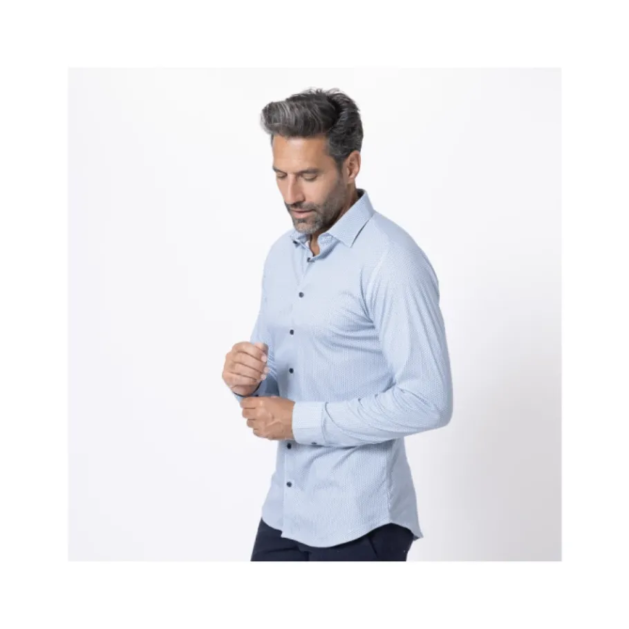 Desoto wit overhemd met blauwe geometrische patronen all-over. Gemaakt van katoenen jersey. Lange mouwen. Verstelbare knoopmanchetten. Klassieke kraag. Knoopsluiting. Wijdvallend en aansluitend model. Labelvrij voor maximaal comfort. Model is 183 cm lang en draagt maat M.