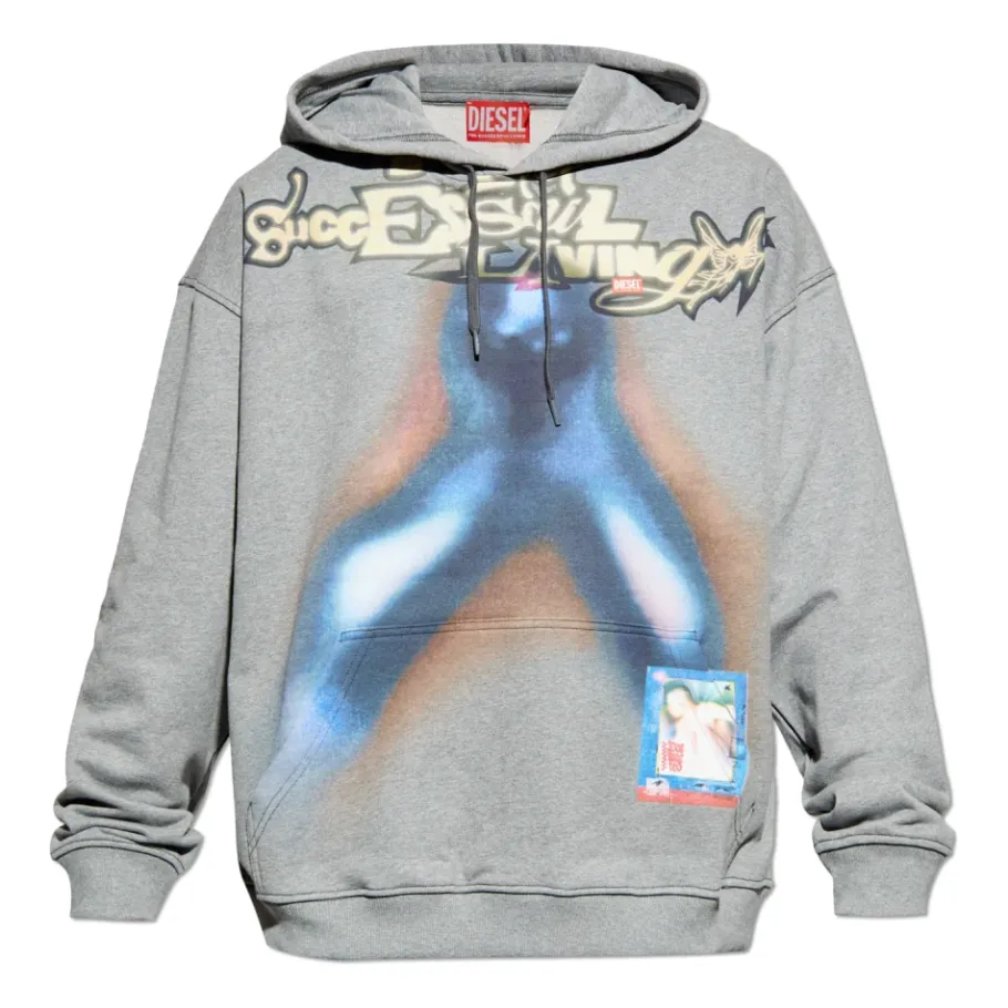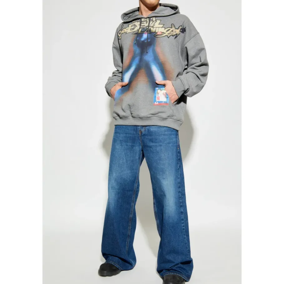 De Diesel S-BOXT-HOOD-V4 Hoodie combineert een oversized urban silhouet met een opvallende abstracte graphic en street-art details, ontworpen voor statement casual wear. Belangrijkste kenmerken: Blauw | Grijs | Katoen | Comfortabel | | Vormvast | Ruime capuchon | Kangoeroezak | Abstracte blauw-witte graphic | Street-art graffiti stijl | Fotografische patch in de linkeronderhoek met rode letters | Intern label met rood DIESEL logo | Afmetingen & pasvorm: Lengte: 193 cm | Borst: 95 cm | Taille: 82 cm | Heupen: 93 cm | Oversized fit | Model draagt maat XXL | Samenstelling & onderhoud: 100% katoen | Machinewas, plat drogen