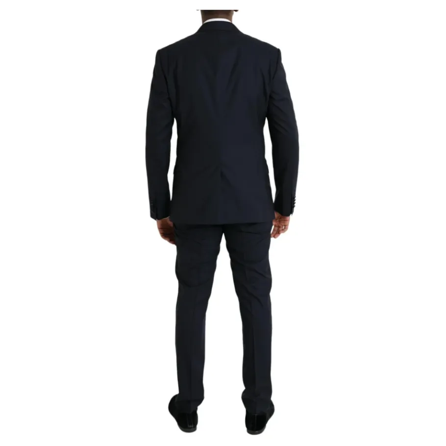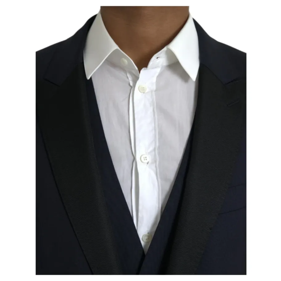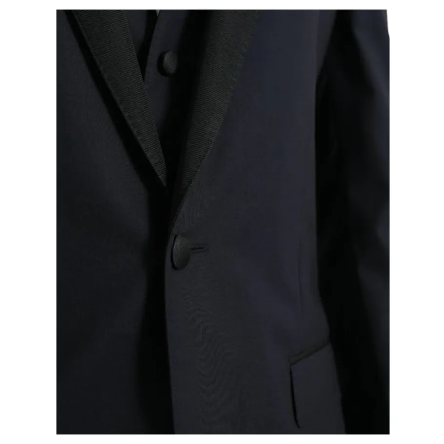 Verhoog je stijl met dit 100% authentieke Dolce & Gabbana MARTINI pak in donkerblauw. Dit single-breasted 3-delig pak bestaat uit een blazer, broek en vest, allemaal vervaardigd met een luxueuze mix van 86% zuivere wol, 12% zijde en 2% polyester. De slanke pasvorm heeft een enkele knoopsluiting, voering van 90% zijde en 10% viscose, binnenzakken en een enkele open split aan de achterkant. Gemaakt in Italië voor de veeleisende heer.