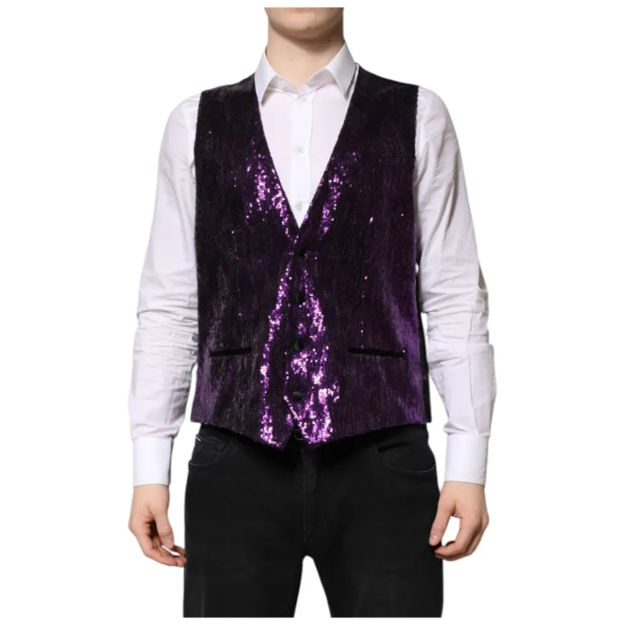 Upgrade je formele look met deze prachtige Dolce & Gabbana gilet in paarse pailletkleur. Gemaakt in Italië, deze 100% authentieke gilet heeft een enkele rij knopen model, verstelbare tailleband aan de achterkant en logo details. Gemaakt van een luxueuze mix van nylon, polyester, zijde en elastaan. Perfect voor de moderne heer.