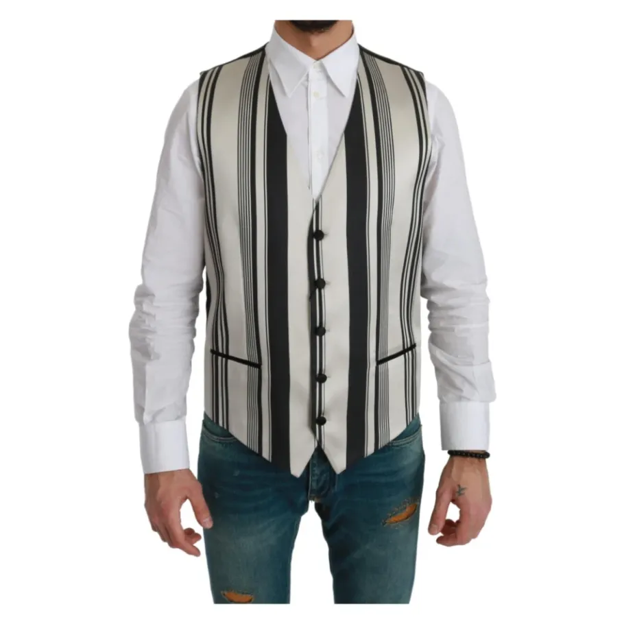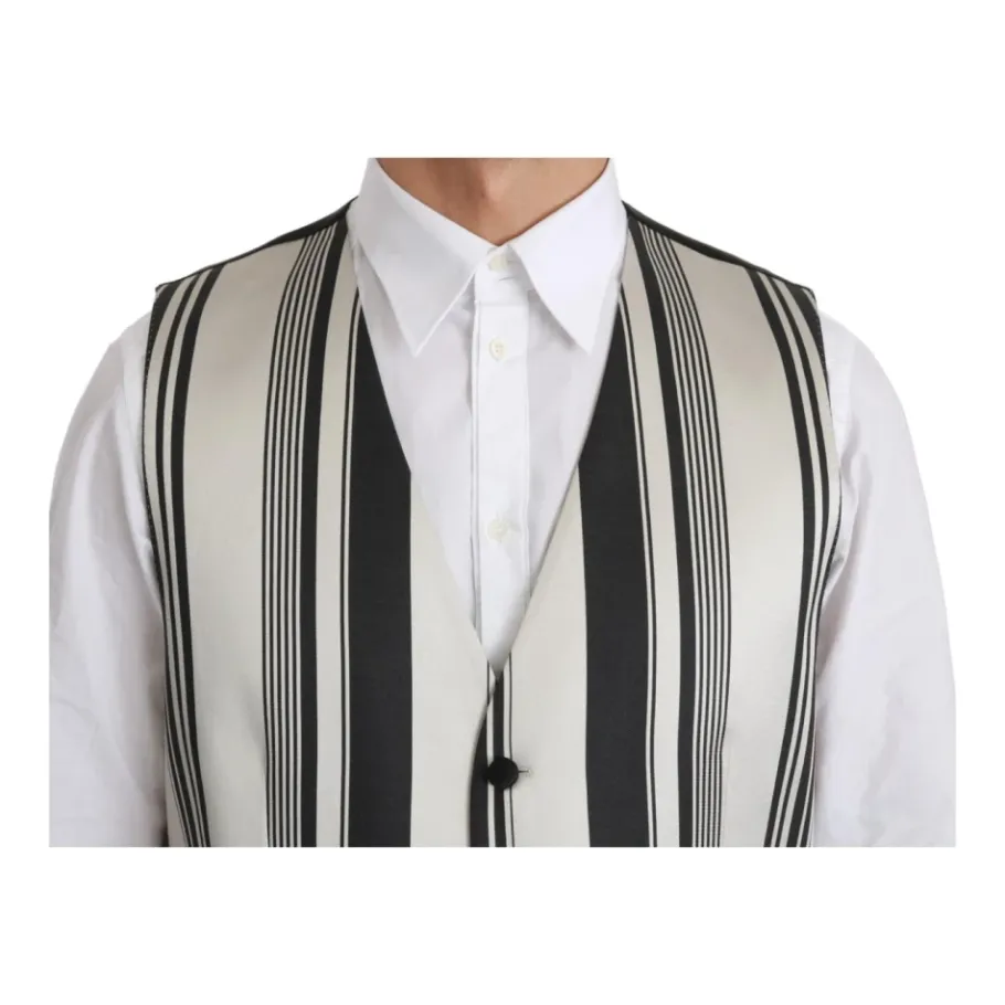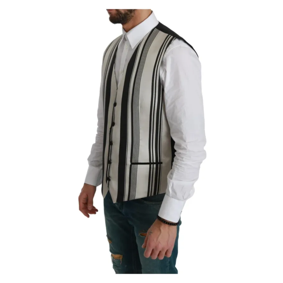 Upgrade je formele look met deze gloednieuwe, 100% authentieke Dolce & Gabbana Dress Vest. Met zwarte en off-white strepen is deze formele vest gemaakt in Italië van een luxe mix van 70% katoen en 30% zijde. Het heeft een sluiting met vijf knopen, twee voorzakken en kenmerkende logo-details.