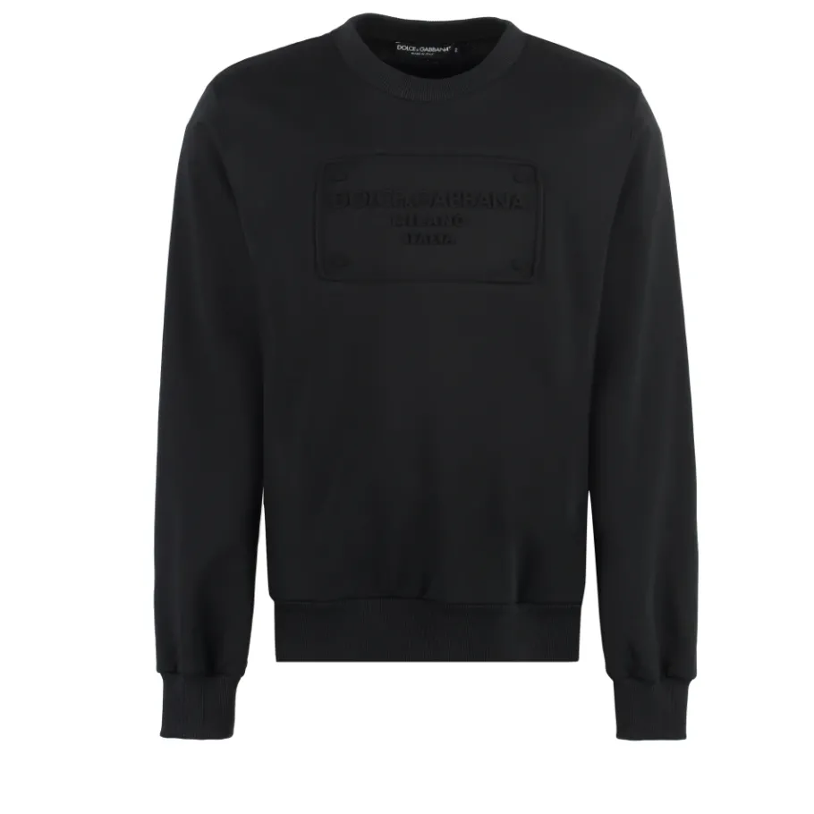 De Dolce & Gabbana Logo detail katoenen sweatshirt combineert een strak silhouet met ronde hals en een verhoogd logo detail voor een verfijnde alledaagse look. Belangrijkste kenmerken: Zwart | Katoen | Stretchstof | Logo in reliëf aan de voorkant | Geribbelde boorden | Ronde hals | Lange mouwen | Samenstelling & verzorging: 95% Katoen, 5% Elastan (hoofdstof) | Ribboord: 100% Katoen | Handwas