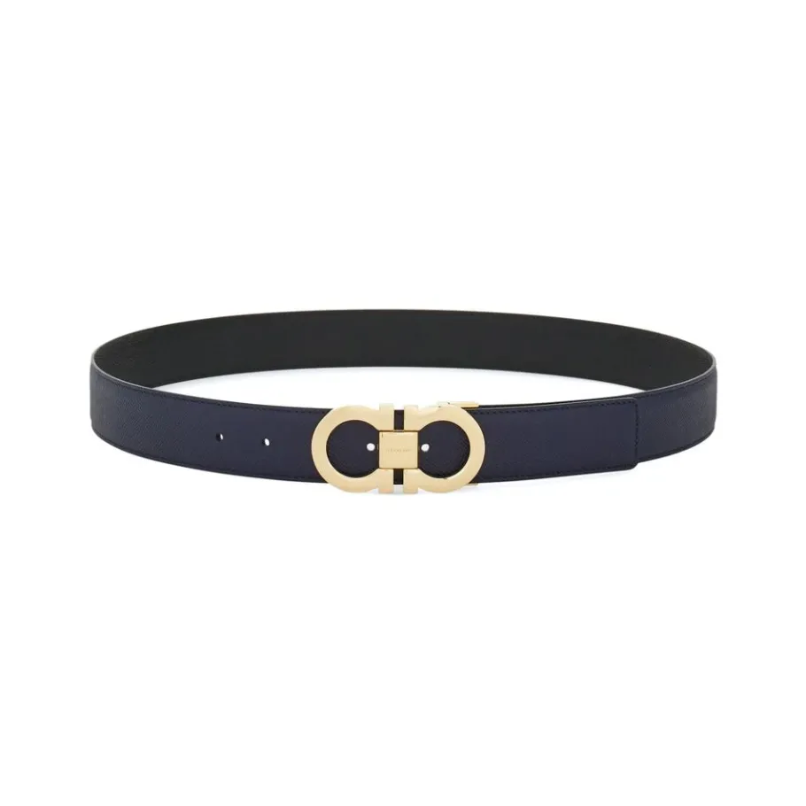 Verrijk uw stijl met deze omkeerbare Ferragamo riem, vervaardigd uit premium blauw en zwart kalfsleer. De opvallende Gancini-gesp geeft een verfijnde touch aan elke outfit. Belangrijkste kenmerken: Blauw | Zwart | Kalfsleer | Verstelbare pasvorm | Geponste gaten | Gancini-gesp | Pin sluiting | Goudkleurige hardware | Afmetingen en pasvorm: Verstelbare pasvorm | Samenstelling en onderhoud: Kalfsleer | Reinig met een zachte doek.