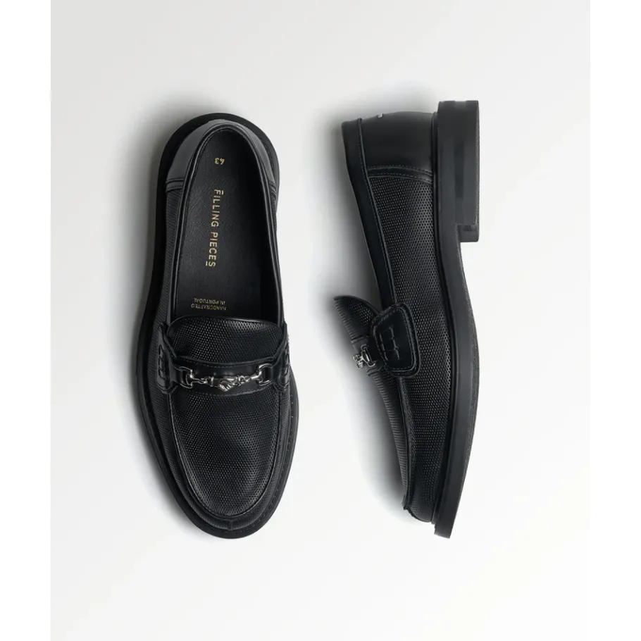 Ontdek de Loafer Aten, een klassieke loafer van Filling Pieces, ontworpen met een custom rubberen FP zool voor een verfijnde look en comfort. Het geperforeerde nappa bovenwerk met matte nappa details zorgt voor elegantie en ademend vermogen. Belangrijkste kenmerken: Zwart | Nappa leer | Ademend | Geperforeerd bovenwerk | Matte details |