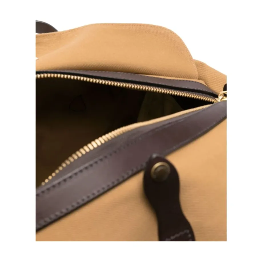 Filson weekendtas in chocoladebruin/beige katoen/kalfsleer met reliëflogo, twee bovenhandvatten, verstelbare afneembare schouderriem en bovenritssluiting. Afmetingen: 30,0 cm diepte, 32,0 cm handvat hoogte, 26,0 cm hoogte, 46,0 cm breedte. Ideaal voor de moderne man onderweg.