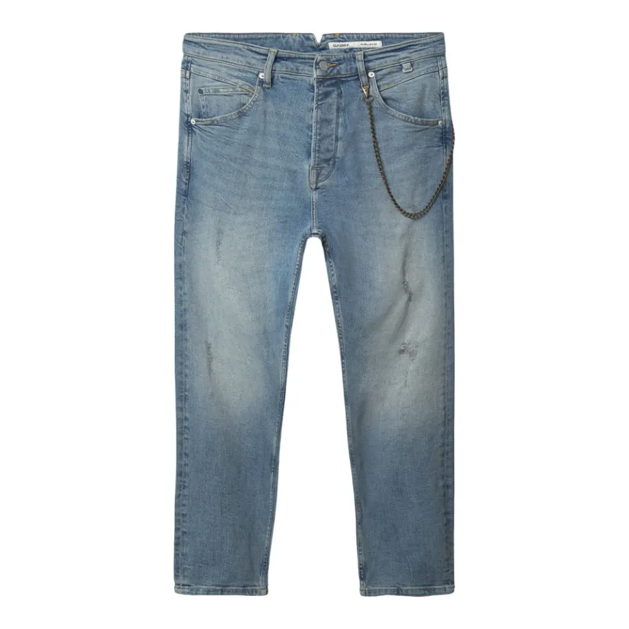 Gabba Alex Cros Cropped zijn cropped denim jeans die een kenmerkende kruisarcering combineren met metalen kettingdetails voor een urban, casual look. Ontworpen voor dagelijks gebruik, ze balanceren stijl en comfort met een taps toelopend silhouet. Belangrijkste kenmerken: Blauw | Lichtblauwe denim | Katoen | 12oz denim gewicht | Stretchstof voor extra comfort | Verborgen ritssluiting | Zijzakken en achterzakken | Metalen kettingversiering | Kruisarcering stoftextuur | Gebruikt effect aan de voorkant en beenopeningen | GABBA logoknoop | Afmetingen & pasvorm: Taps toelopende pasvorm | Cropped lengte | Samenstelling & onderhoud: 78% katoen | 20% katoen | 2% elastaan | Machinewas op 40 °C.
