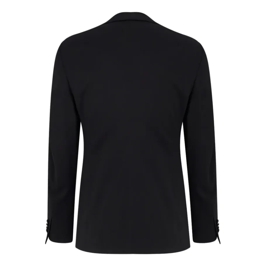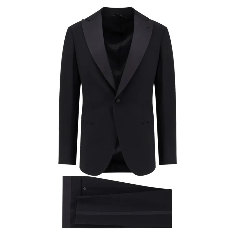 Giorgio Armani Enkelrijig Getailleerd Pak, vervaardigd uit scheerwol met een jas met één knoop en satijnen piek revers, ontworpen voor formele gelegenheden en avondgelegenheden. Belangrijkste kenmerken: Zwart | Scheerwol | Sluiting met één knoop | Twee paspelzakken aan de voorkant | Borstzak | Broek met zijzakken | Broek met twee paspelzakken met knoopsluiting aan de achterkant | Satijnen piek revers | V-halslijn | Lange mouwen | Enkelrijige tailoring | Rechte zoomlijn broek | Afmetingen & pasvorm: Regular fit | Samenstelling & verzorging: 100% scheerwol | Voering: Zijde