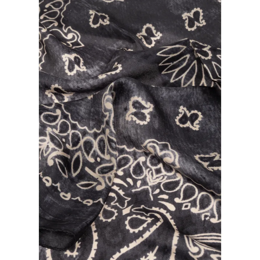 Navy en grijze sjaal met een crèmekleurig paisley patroon van Golden Goose. Gemaakt van zijde. Breedte: 66 cm Lengte: 66 cm Modelmaten Hoogte: 193 cm Borst: 95 cm Taille: 82 cm Heupen: 93 cm