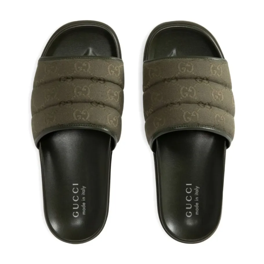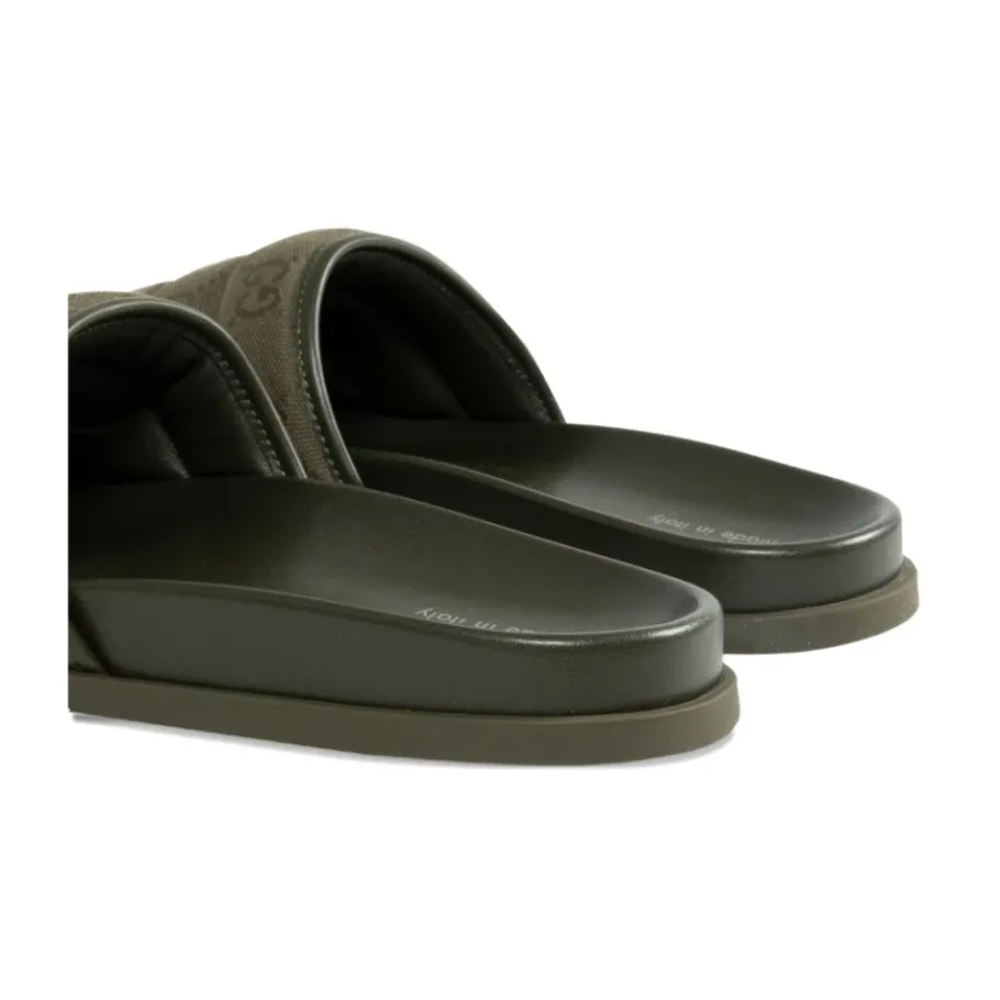 Stap in stijl met deze Gucci olijfgroene GG-monogram canvas gewatteerde sliders voor heren. Met open neus, platte zool en instapmodel.