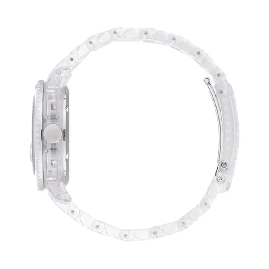 De Ice-Watch Clear Sunset – Fire is een levendig horloge voor elke dag met een transparante harskast en een wijzerplaat met een zonsondergangverloop. Het combineert een sportieve look met praktische functies zoals een dag-datum aanduiding en 100 m waterdichtheid. Belangrijkste kenmerken: Transparant | Geel | Oranje | Rood | Hars | Waterbestendig tot 100 m | Japans quartz uurwerk | Dag- en datumkalender | Lichtgevende wijzers en cijfers | Draaiende hars bezel | Vouwsluiting met drukknop | Transparante kast en band | Multicolor verloop wijzerplaat (geel naar rood) | Ronde kast | Arabische cijfers en indexmarkeringen | Afmetingen & pasvorm: Kastdiameter: ca. 40 mm | Kasthoogte: ca. 13 mm | Bandbreedte: 20 mm | Bandlengte: ca. 18 cm | Geschikt voor polsomtrek ca. 16 tot 22 cm | Samenstelling & onderhoud: Hars kast (plastic) | Plastic band | Mineraalglas | Roestvrijstalen achterkant