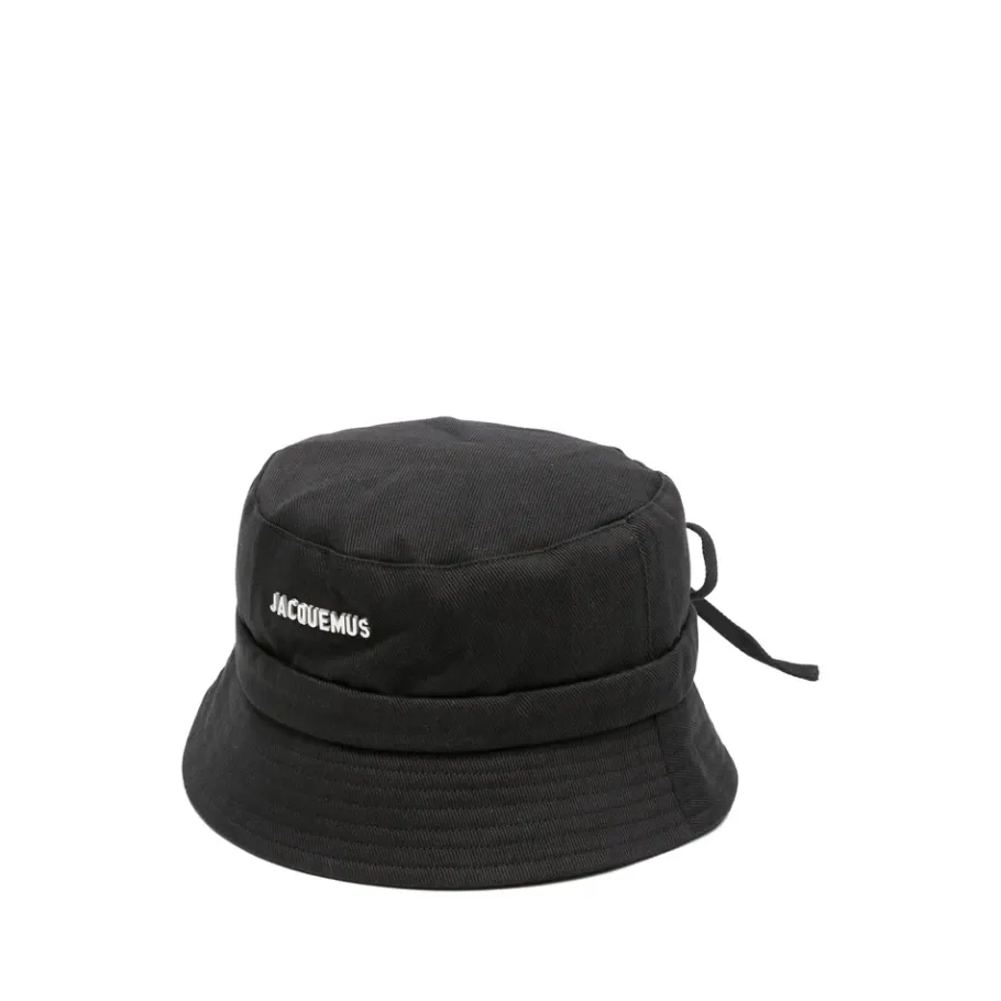 Upgrade je stijl met deze zwarte Jacquemus hoed met zelfbindende sluiting, platte kroon, zilverkleurige logo belettering en een smalle, aflopende rand. Rand meet 5,5 centimeter met een omtrek van 59,5 centimeter. Perfect voor de moderne man.