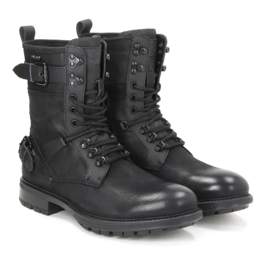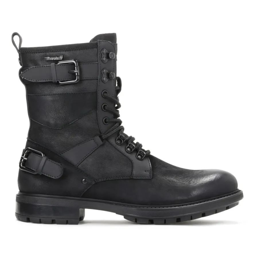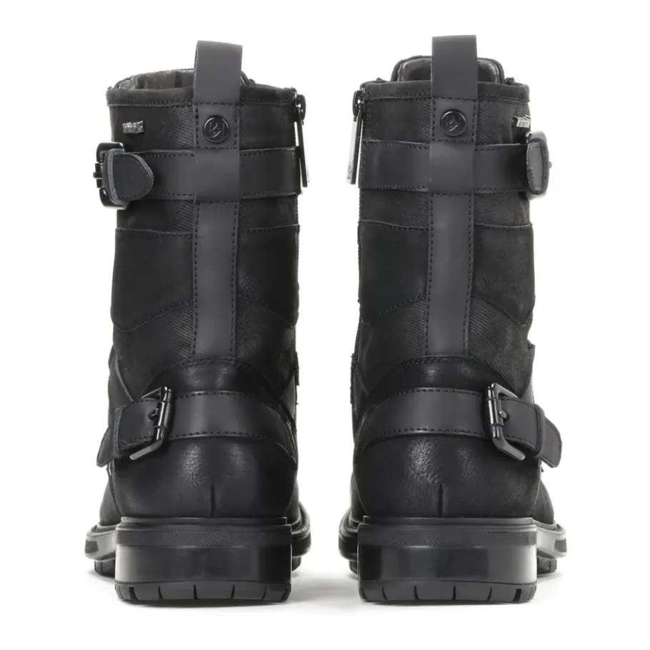 Heren zwarte enkellaarsjes gemaakt van hoogwaardig nubuck, leer met een matte afwerking en textielmateriaal zijn geïnspireerd op de motorstijl. De extravagante look wordt gegeven door expressieve strepen met metalen gespen, hoge veters en haken voor veters. De opmerkelijke combinatie van contrasterende materialen trekt ook de aandacht. De gepresenteerde laarzen zijn perfect voor dagelijkse, stedelijke stylings. Gesloten met een rits aan de binnenkant van de bovenkant. Geïsoleerd van binnenuit in Thinsulate-technologie, die dankzij meer luchtkamers zorgt voor uiterst effectieve warmtebehoud.
